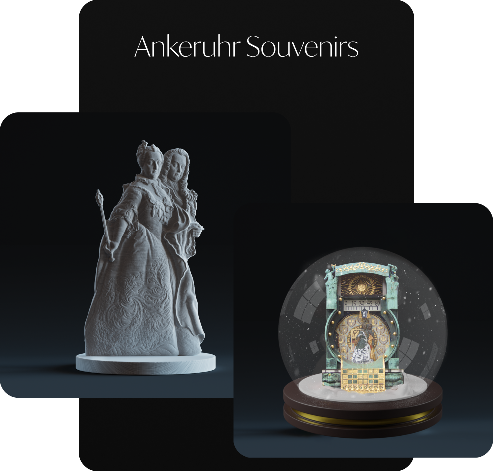 Als Besitzer von Original Ankeruhr NFTs haben Sie exklusiven Zugang zum Onlineshop von Ankeruhr Souvenirs wie der Schneekugel oder dem 3D-Druck von Kaiserin Maria Theresia und Kaiser Franz I. von Lothringen. Sie erhalten nach dem Kauf von Ankeruhr NFTs einen Link zum Souvenirshop per E-Mail.